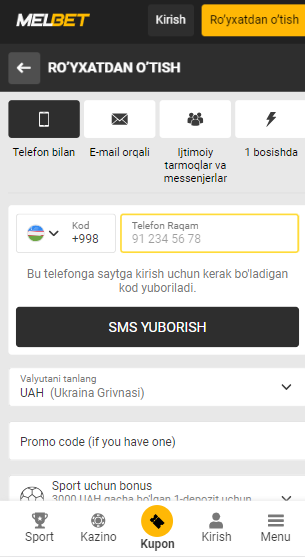 - Mobil telefon raqami orqali ro‘yxatdan o‘tish.